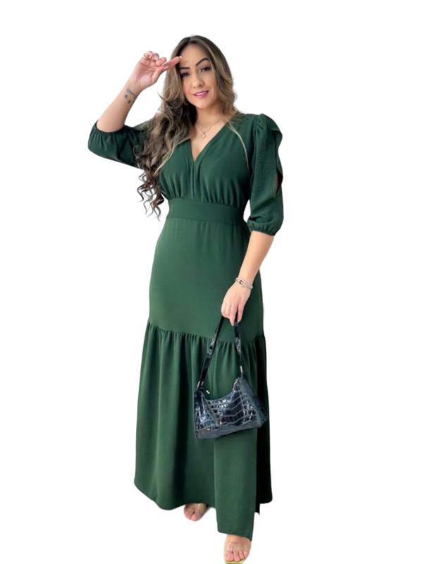 Gior Style Vestido longo feminino tecido duna não amassa com abertura na Manga e fenda. Moda evangélica Vestido festa madrinha com elástico nas costa