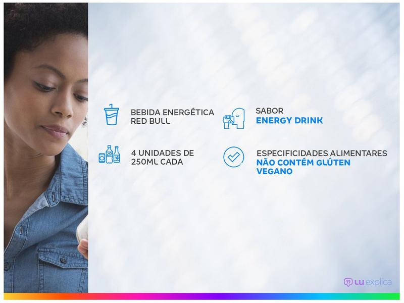 Red Bull te dá asas! inspirado por bebidas funcionais do extremo oriente, dietrich mateschitz fundou a red bull em meados dos anos 80. Ele criou a fórmula e desenvolveu o conceito de marketing exclusivo ao lançar o primeiro Red Bull Energy Drink em 1º de abril de 1987 na áustria. Uma nova categoria de produtos – energéticos - nascia. O Red Bull Energy Drink é apreciado em todo o mundo por atletas de elite, profissionais dinâmicos, estudantes ativos e motoristas em viagens longas. O que existe dentro da lata cafeína: a cafeína já era conhecida por seus efeitos estimulantes pelas civilizações antigas, que a consumiam a partir de fontes naturais como o chá, café grãos de cacau e noz de cola. Taurina: taurina é um aminoácido natural do corpo humano, que está presente na dieta diária das pessoas e está envolvida numa vasta gama de processos biológicos. Vitaminas do grupo B: as vitaminas são micronutrientes essenciais necessários para manter as funções normais do organismo. Açúcares: Red Bull Energy Drink é feito com açúcar proveniente da beterraba. Água das fontes alpinas: naturalmente, a água é um ingrediente crucial da Red Bull. Nesta embalagem você leva 4 unidades de 250ml cada.