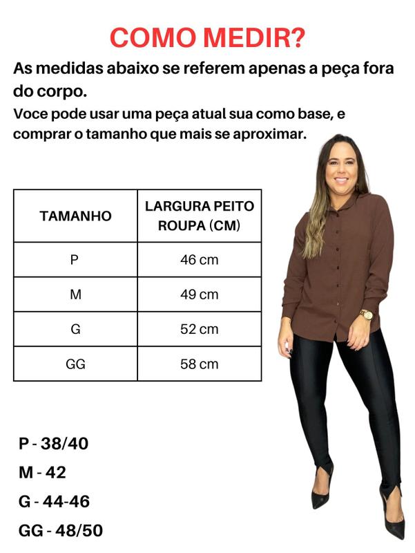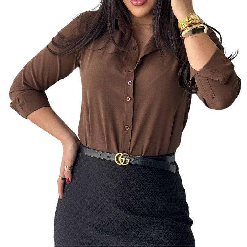 Camisa Social Feminina Branca Botões Moda Blogueira Crepe Dunas Caimento perfeito Tecido não amarrota Disponível do tamanho P ao GG P - 38/40 M - 42 G - 44/46 GG - 48/50 Tabela de medidas disponivel nas fotos. Aymee, Camisa Feminina, Camisa Feminina Social Manga, Camisa Manga, Camisa Social, Camisa Social Manga, G, GG, M, Marrom, Moda e Acessórios, P