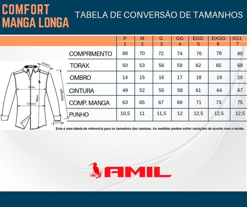 DESCRIÇÃO DO PRODUTO Camisa Amil KRIPTO Manga Longa Detalhes: • Modelagem: Comfort • Composição: 100% Poliéster • Tamanhos disponíveis: 1, 2, 3, 4, 5, 6, 7 • Bolso: Não • Ocasiões : Festas casuais e sociais, dia a dia, trabalho, uniformes • Referência: 3015 Garantia de Qualidade: • Todos os produtos são originais e autênticos. • Trabalhamos com fornecedores que valorizam matérias-primas de alta qualidade e acabamentos perfeitos. Sobre a Loja Santos e Caires : • Empresa líder em vendas de vestuário na Magalu. • Produtos inovadores, entrega rápida e promoções frequentes. Perguntas Frequentes: • Como escolher o tamanho ideal? Consulte a tabela de medidas nas fotos do anúncio. • Como verificar as cores disponíveis? Selecione o tamanho desejado e veja as opções de cores disponíveis. • As camisas possuem a mesma modelagem? Não, há diferenças entre Slim, Comfort e Tradicional Slim – Mais acinturada com a manga mais justa e no caso da MC mais curta. Comfort – Cintura e manga um pouco mais solta que a Slim. Clássica – Corte reto nas laterais e com as mangas maiores e mais largas. COMFORT 1/ P Veste uma pessoa de Até 71 kg 2/ M Veste uma pessoa de Até 81 kg 3/ G Veste uma pessoa de Até 91 kg 4/ GG Veste uma pessoa de Até 101 kg 5/ EGG Veste uma pessoa de Até 111 kg 6/ XGG Veste uma pessoa de Até 118 kg 7/ XG1 Veste uma pessoa de Até 131 kg • Os produtos são originais? Sim, são produtos brasileiros de alta qualidade. • Como combinar múltiplas peças em um único frete? Adicione os itens desejados ao carrinho e finalize a compra em um único pagamento. Por favor verificar as medidas do produto descritas no anuncio para evitarmos problemas devido ao tamanho comprado. Caso tenha dúvidas sobre o tamanho entre em contato conosco através do campo de "perguntas e respostas". TABELA DE TAMANHO SE ENCONTRA NA ULTIMA IMAGEM DO ANUNCIO. Todos os modelos do anuncio a PRONTA ENTREGA! Produto vendido pela loja Digital Modas.