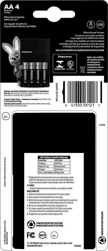 🔗 COMPRE AQUINão tem nada mais chato do que precisar utilizar algum equipamento e notar que ele está com as pilhas descarregadas, não é mesmo? Com o carregador de pilhas CEF14 da Duracell você não terá mais que passar por essas situações! Ele possui capacidade para carregar 4 pilhas simultaneamente e é compatível com os modelos AA e AAA. Contém atributos de segurança que garantem o carregamento seguro de suas pilhas e possui sistema de desligamento automático quando elas estão 100% carregadas, evitando superaquecimento do equipamento. O tempo de recarga total dura entre 4h a 8h e ele ainda acompanha 4 pilhas AA recarregáveis.