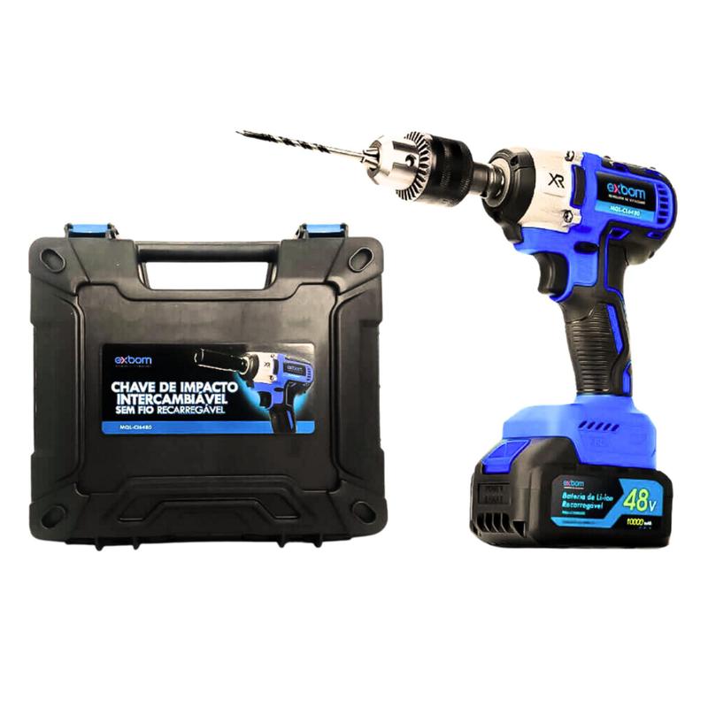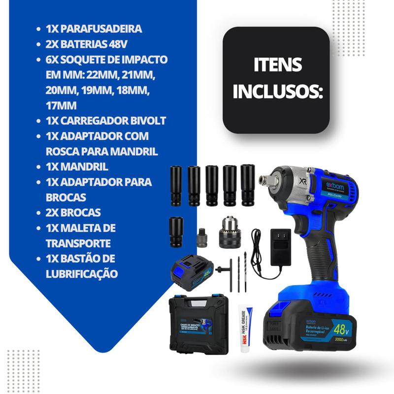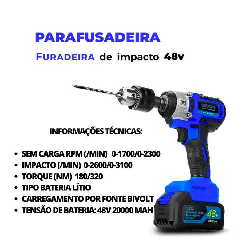 Chave Impacto Furadeira Parafusadeira Sem Fio Bateria 48v Carregamento Bivolt Portatil Exbom