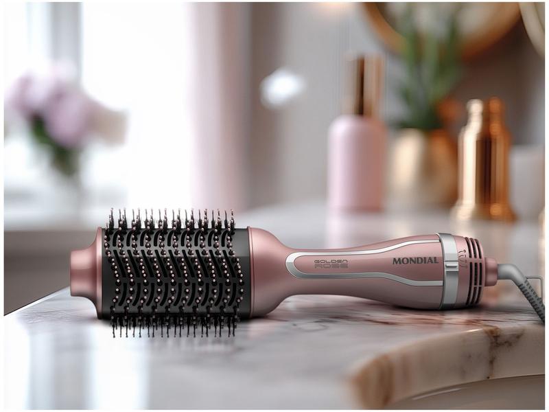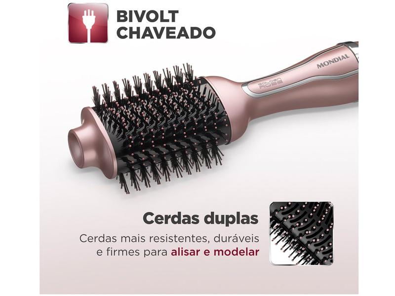 Conheça a escova secadora Mondial ES-02-BI na cor golden rosé. A escova 3 em 1 que seca, alisa e modela em um único produto. Você fica linda e com a praticidade de cuidar dos cabelos com apenas uma mão. A escova tem 1200W de alta potência, 3 níveis de temperatura e tecnologia de revestimento cerâmico com Tourmaline Íon: fecha as cutículas dos fios e reduz o frizz. O produto é Bivolt chaveado, sendo necessário selecionar na chave seletora a seleção desejada (110V ou 220V). O formato com design oval é perfeito para alisar, além de também ser um aliado para quem quer dar volume às mechas. As cerdas duplas são mais resistentes, duráveis e firmes para alisar e modelar seus cabelos. O cabo é giratório em 360°, que não enrola durante o uso. Ponta fria: A ponteira da escova não aquece e protege suas mãos durante o uso. Atenção: Não é escova rotativa.