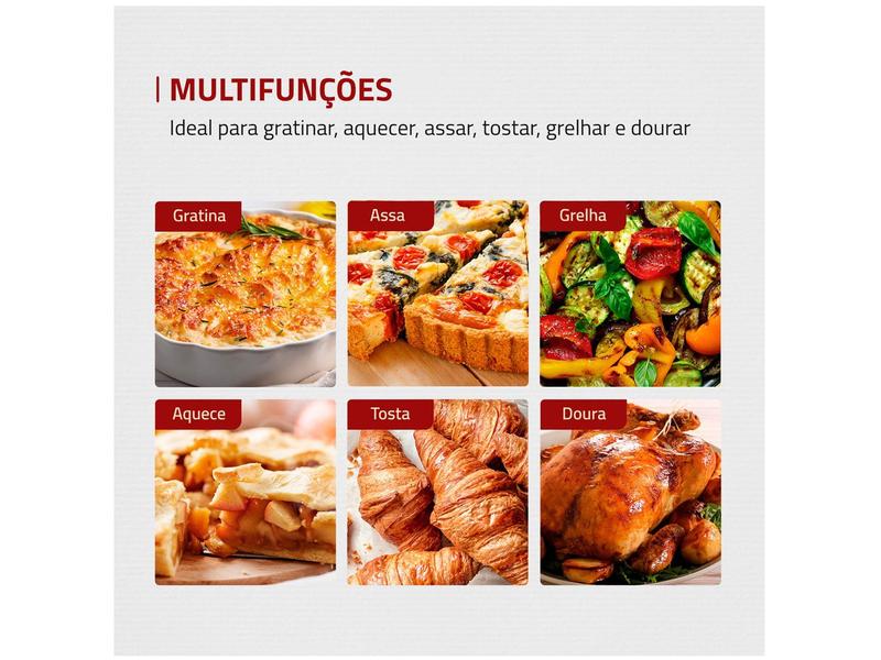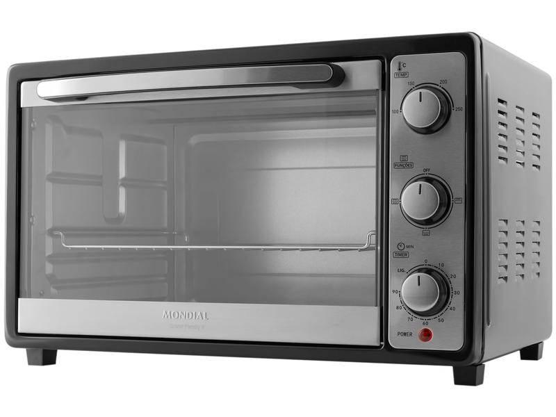 Com capacidade de 52 litros, o forno elétrico FR-52 Grand Family II da Mondial aquece, cozinha, tosta, assa e grelha. Ele tem ajuste de temperatura até 250ºC, timer de 90 minutos, com alarme e desligamento automático, além de 1800W de potência. Este forno elétrico de bancada é prático e econômico, deixando os alimentos crocantes mais rápido. Suas resistências elétricas inferior e superior têm aquecimentos independentes, e você pode escolher com o botão superior qual resistência ligar. Com ele, você prepara os alimentos no tempo certo. Sua grelha tem regulagem de altura, e é removível para facilitar a limpeza. Produzido em PP, Aço Inox e Vidro na cor preto e inox, com design moderno, vai deixar a sua cozinha mais bonita e com vários cardápios deliciosos na mesa!