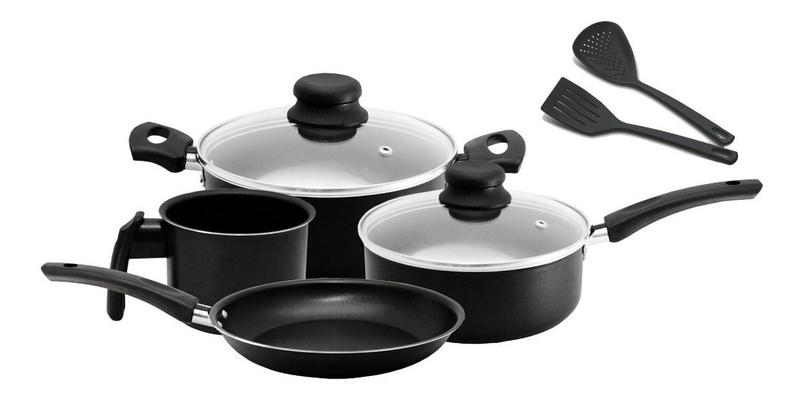 O Conjunto de Panelas Antiaderente 6 peas Linha Unique - ARNIX contm:1 Panela Antiaderente Preta com tampa de vidro, 16 cm de dimetro e capacidade para 1,4 litros.1 Caarola Antiaderente Preta com tampa de vidro, 18 cm de dimetro e capacidade para 1,8 litros.1 Frigideira Francesa Antiaderente Preta de 18 cm de dimetro.1 Esptula Preta de nylon.1 Escumadeira Preta de nylon.1 Caneco Antiaderente Preto de 12 cm de dimetro e capacidade para 1,0 litros.** PRODUTOS DIRETO DA FBRICA **Antes de usar: Lave interna e externamente o utenslio, usando apenas uma esponja macia, sabo neutro ou detergente lquido. Enxugue bem com um pano seco e unte todas as partes internas com leo ou gordura. Leve ao fogo baixo por um ou dois minutos. Deixe a pea esfriar, lave e enxugue novamente. Durante o uso: Evite esquentar demais o utenslio vazio. Use o seu utenslio sempre em fogo baixo ou mdio para reter o valor nutritivo dos alimentos e conservar o antiaderente. Evite que as chamas atinjam as laterais do utenslio. O utenslio com antiaderente no pode ser aquecido a temperaturas superiores a 350C. Para mexer ou tirar o alimento, use somente utenslios de silicone, nylon ou madeira que no cortam e no riscam a superfcie dos produtos. Nunca corte alimentos diretamente no revestimento antiaderente. Limpeza: Evite a imerso do utenslio quente em gua fria. Deixe o utenslio esfriar antes de lavar. Mesmo depois de vrios usos nunca utilize produtos abrasivos na lavagem. Arnix, Jogo, Jogo Antiaderente, Jogo De Panelas Antiaderente, Jogo Panelas, Jogo Panelas Antiaderente, Jogo de Panelas, Utilidades Domésticas