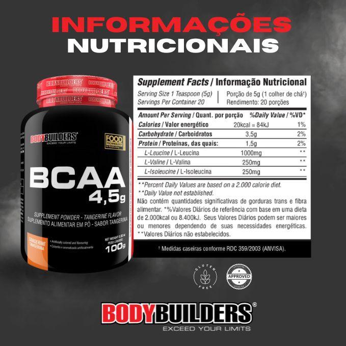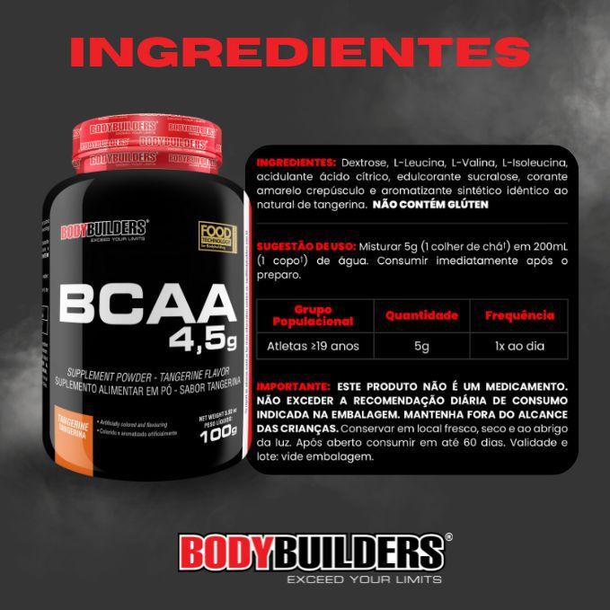 2x BCAA 100g sabor Tangerina: O BCAA 4,5 Bodybuilders é seu aliado antes e após o treino. Fornecendo energia, retardando a fadiga central e estimulando a síntese de proteínas musculares, ele é essencial para recuperação e crescimento muscular.