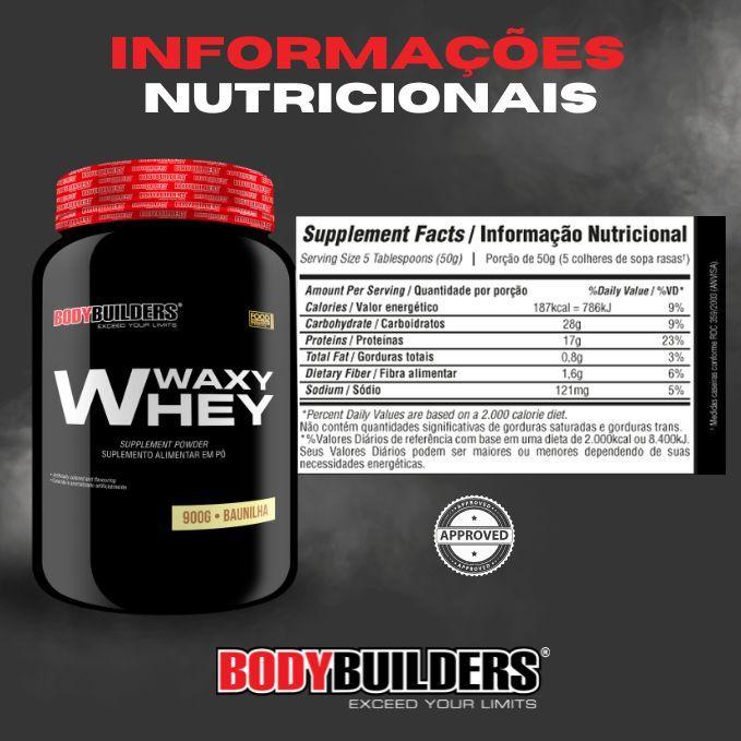 Whey Protein Waxy Whey 900g: Adicionar 50g (5 colheres de sopa rasas) em 350mL (1 3⁄4 copo) de água gelada e agite por 20 segundos. Consumir imediatamente após o preparo.