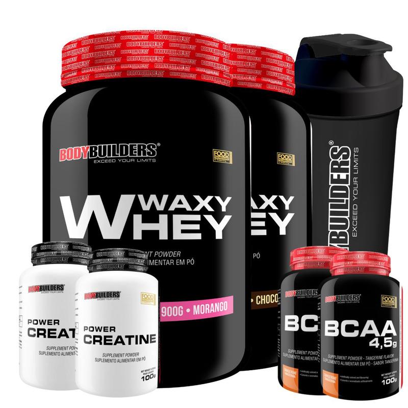Kit 2x Whey Protein Waxy Whey Pote 900g + 2x BCAA 100g Tangerina + 2x Power Creatina 100g + Coqueteleira 600ml- Bodybuilders