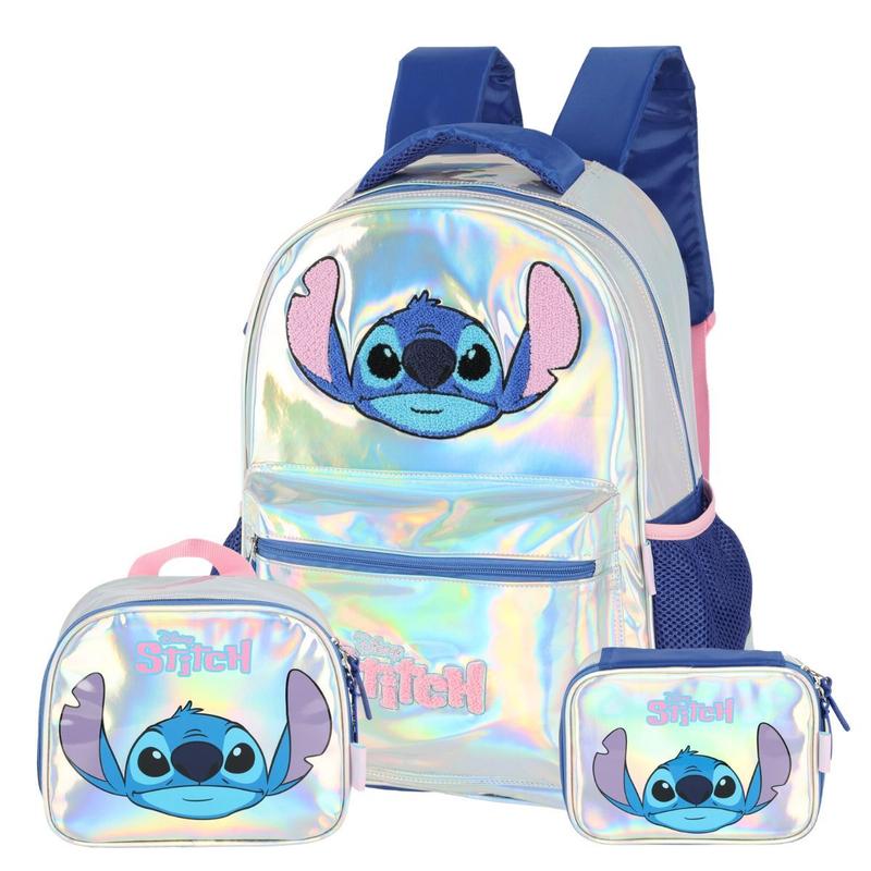 Kit Mochila Costas Holográfica Stitch Lancheira e Estojo Box Disney