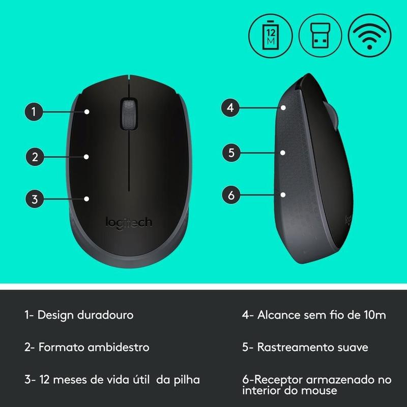 Mouse sem fio Logitech M170 com Design Ambidestro Compacto, Conexão USB e Pilha Inclusa, Preto - 910-004940