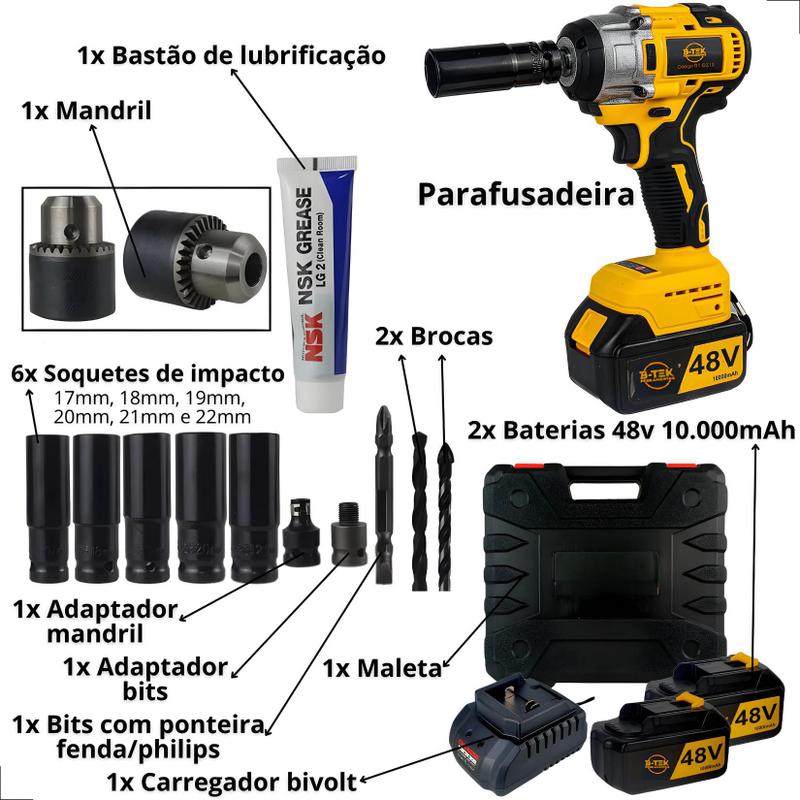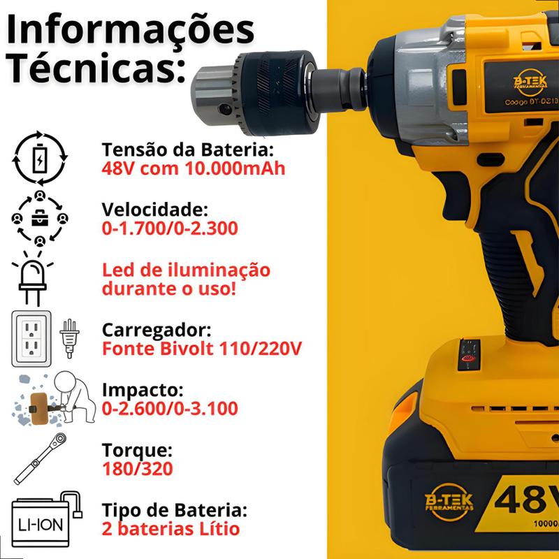 Não perca mais tempo com parafusadeiras comuns! Adquira agora a Parafusadeira Furadeira Chave de Impacto 48V da B-Tek e alcance resultados de excelência em suas atividades profissionais ou hobbys. Aproveite esta oportunidade única! Clique no botão ‘comprar’ e garanta a sua!