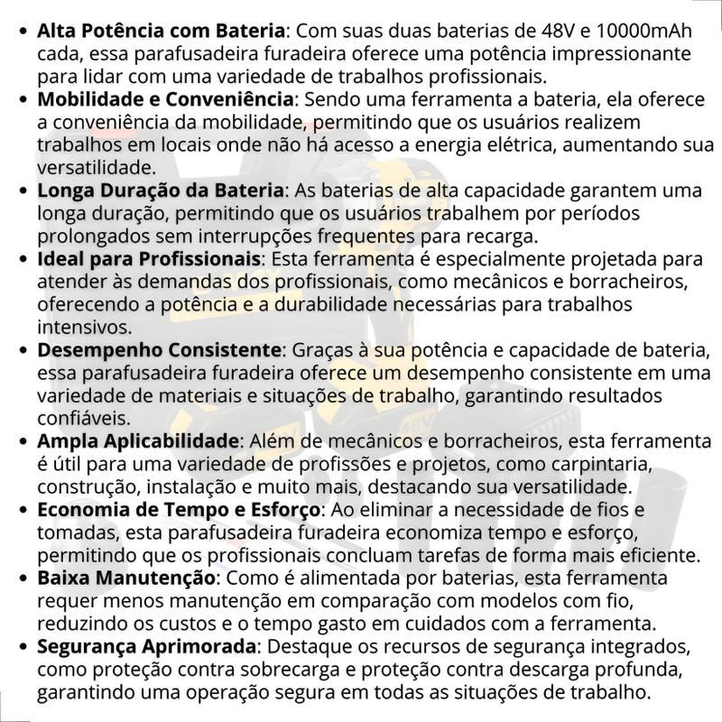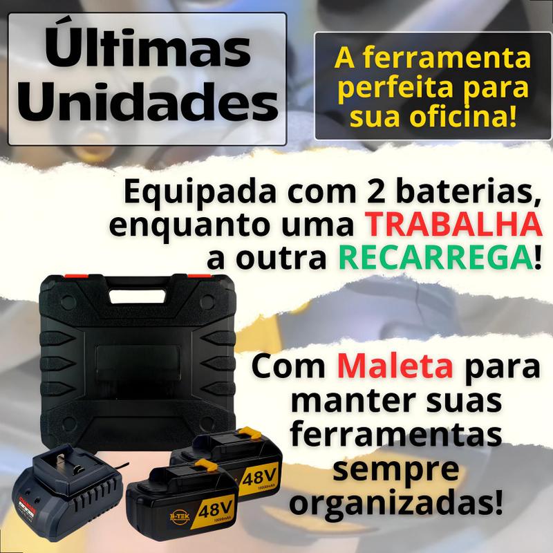 Aproveite esta oportunidade para adquirir a Parafusadeira Furadeira Chave de Impacto 48V da B-Tek e elevar o nível de suas atividades profissionais e hobbies. Você não vai querer perder essa chance!
