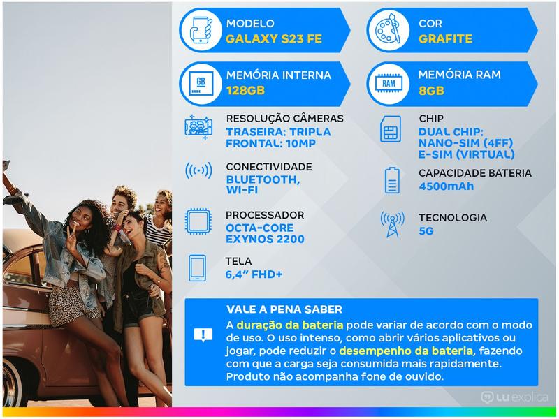O Galaxy S23 FE na cor grafite é um dos smartphones da Samsung. Com design elegante e moderno, uma tela grande e vibrante e um poderoso conjunto de câmeras. Ele é equipado com o processador Octa-Core Exynos 2200, para navegar na web, assistir vídeos, jogar jogos e muito mais sem problemas, 8GB de memória RAM e 128GB de armazenamento interno, que é suficiente para armazenar fotos, vídeos, músicas e outros arquivos. Tudo isso, garante um desempenho rápido e fluido. A tela é infinita Dynamic AMOLED 2X de 6,4" (158,9mm) com resolução FHD+ (1080x2340), que proporciona imagens nítidas e vibrantes, enquanto a câmera traseira tripla de 50MP + 12MP + 8MP e a câmera frontal de 10MP, permitem tirar fotos e vídeos de alta qualidade com diferentes opções de lentes para capturar diferentes tipos de imagens e postar nas redes sociais. O Galaxy S23 FE também é compatível com a tecnologia 5G, para você aproveitar da velocidade de internet ultrarrápida independente do lugar em que estiver. Se você está procurando um smartphone poderoso e versátil, o Galaxy S23 FE é uma ótima opção. Ele é perfeito para quem quer um telefone que pode ser usado para trabalho, lazer ou para as duas formas de uso. Com Corning Gorilla Glass 5 protegendo a parte frontal e traseira, ainda possui acabamento em alumínio e classificação IP68 de resistência a poeira e água, é um aparelho para durar e acompanhar sua rotina. Atenção: Produto não acompanha fone de ouvido.